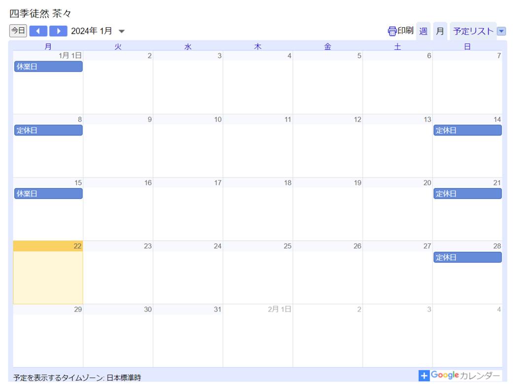 ホームページで営業カレンダーを確認できるようになりました 2024.02.08 いつも四季徒然 茶々をご利用いただきまして、誠に有難うございます。 この度、ホームページ上に営業カレンダーを表示できるようにいたしました。 定休日や臨時休業のほか、予約で席が埋まっていたり、お席の用意が残りわずかであることなどをこちらのカレンダーにてお伝えしていきます。 2月は定休日は4日(日)、12日(月祝)、18日(日)、25日(日)です。 2月10日(土)は満席となっておりますので、ご了承ください